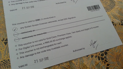 Hari ini Sop ingin membuat cabutan bertuah kepada rakan-rakan yang ingin menonton wayang Golden Village Cinema (GSC). 2 kupon GSC untuk yang bertuah boleh menukar kepada 2 tiket wayang di mana-mana GSC. Coupon tersebut sah sehingga September nanti :)