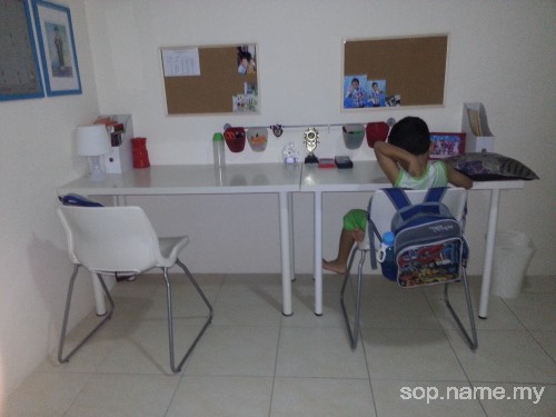 Sebelum ini, Sop beli hanya 1 meja 2 kerusi dari IKEA. Oleh kerana tidak digunapakai untuk belajar, meja tersebut telah diletak komputer untuk kegunaan anak-anak. Sekarang ini Azfar telah darjah 1, terdapat kerja-kerja sekolah yang perlu dibuat rumah. Jika pra sekolah dulu memang tiada kerja sekolah, hanya kami yang beri dan minta buat :) Jadi tidak banyak peluang untuk gunakan meja tersebut untuk belajar sepenuhnya.